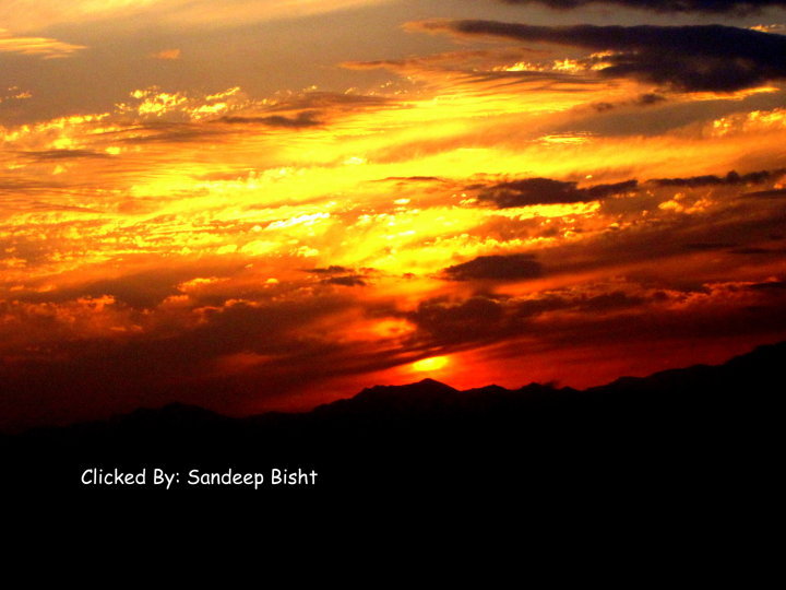 On the right side: The enchanting sunset mystically covered the snow capped Himalayas with golden hues.